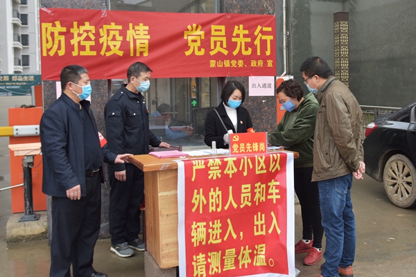 广西壮族自治区蒙山县在各个小区的疫情防控监测点设置党员先锋岗,党员干部24小时值守。图为该县蒙山镇永安社区党员正在对出入小区的人员进行体温检测登记。(广西壮族自治区蒙山县纪委监委供 林志清 摄)