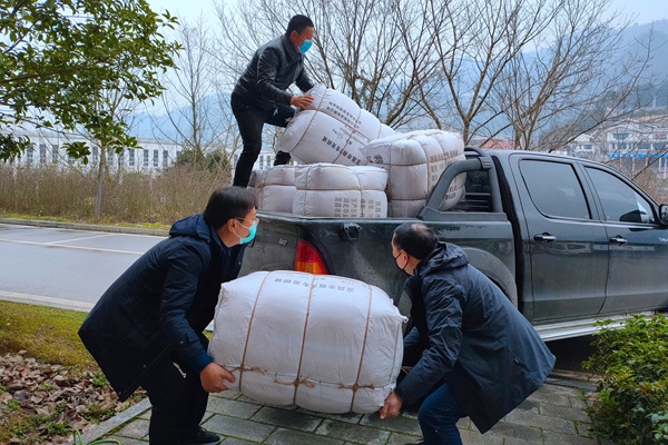 湖北省五峰土家族自治县数千名党员干部投入到了疫情防控阻击战中。图为该县应急管理局党员干部正在对棉被等应急物资进行装车,全力做好应急物资保障供应与储备。(湖北省五峰土家族自治县纪委监委供 简宏莹 摄)