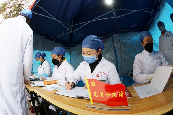 湖北省宜昌市三医院作为新冠肺炎定点收治医院,坚持关键时刻有组织在,关键岗位有党员在,把鲜红的党旗插在狙击疫情的一线。图为“帐篷下的党支部”24小时值守,切实保障医疗收治工作有条不紊。(湖北省宜昌市纪委监委供 王昌明 摄)