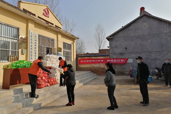 山东省宁津县大曹镇农村党员主动请战到防疫一线,积极开展“我为乡亲跑个腿”志愿服务,为村民集中采购馒头、鸡蛋、蔬菜等生活必需品。图为该镇西武村村民在排队领取生活物品。(山东省宁津县纪委监委供 彭晓明 摄)