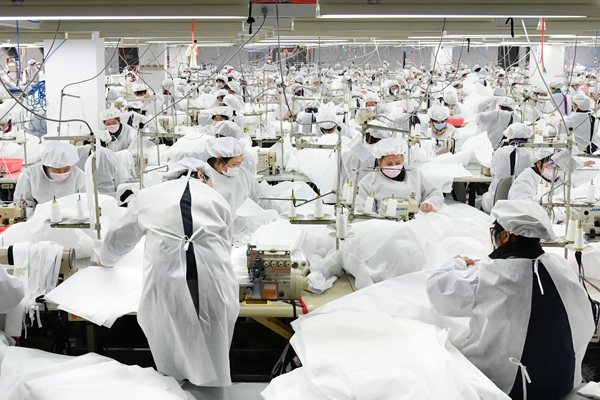 在上海市政府多部门共同努力下,位于该市金山区的嘉麟杰纺织品公司仅用2天就拿到了生产隔离服的相关资质。图为2月9日,该公司车间生产线员工们正全力加紧赶制隔离衣。(上海市金山区纪委监委供 张鹏远 摄)