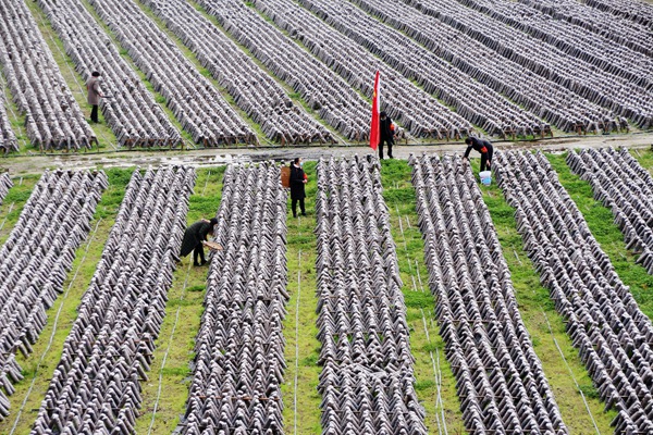 贵州省铜仁市印江自治县缠溪镇缠溪村综合开发专业合作社的黑木耳生产基地,由十多名党员干部、返乡大学生志愿者等组成党员突击队,面戴口罩,正在忙着采收丰产的黑木耳。(贵州省铜仁市印江自治县纪委监委供 田林 摄)