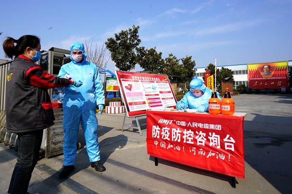 河南省巩义市人民电缆集团一手抓防控疫情,一手抓复工复产,对进出员工逐一进行体温测量、消毒,同时做好信息登记和健康管理等工作,有序推进企业复工。(河南省巩义市纪委监委供 王颖超 摄)