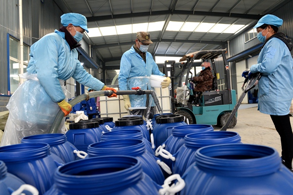 湖北省维美生物科技有限公司在做好疫情防控工作前提下,从1月27日稳妥有序开始复工复产,目前复工率达到95%,全力生产抗抑菌洗手液和84消毒液等紧缺医疗物资,保障疫情防控急需物资供应。(湖北省老河口市纪委监委供 刘兵 摄)