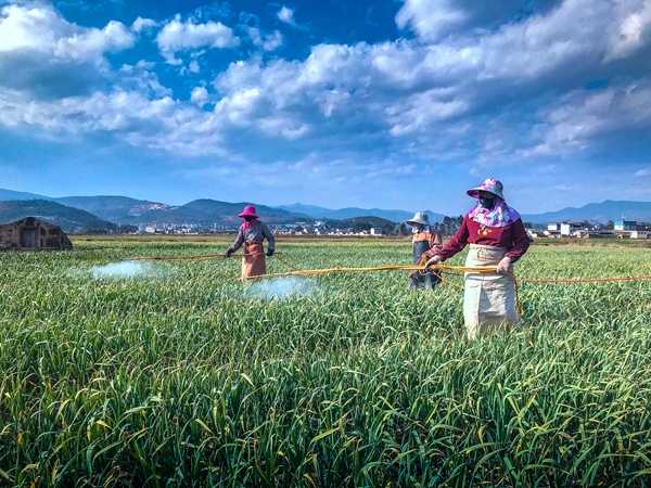 云南省牟定县采取控制人数、分批作业等方式减少人员接触,努力恢复农业生产。图为2月11日,该县共和镇天山村委会大坝村的农户抢抓农时,戴着口罩给正在生长的大蒜喷施化肥农药。(云南省牟定县纪委监委供 田娅 摄)