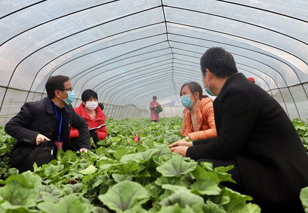 江西省宜黄县纪检监察机关强化责任担当,督促县农业农村局、乡镇、村委会等履职尽责,及时摸清并解决疫情防控期间农业复工复产存在的问题和困难,坚决防止和纠正不作为、慢作为的现象。图为2月10日,该县纪委监委派驻县农业农村局纪检监察组深入二都镇白槎村蔬菜种植基地,实地了解复工复产及干部作风情况。(江西省宜黄县纪委监委供 李明珠 摄)