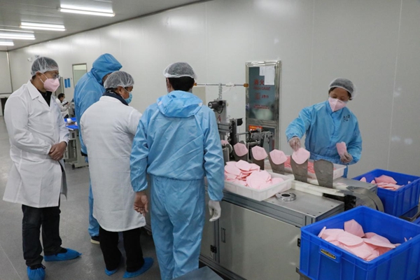 2月12日,经湖北省十堰市郧阳区委、区政府批准,湖北兵兵药业(集团)有限公司正式复工。该公司利用现有净化车间、设备、生产线及物料系统应急生产75%的医用酒精、84消毒液、免洗手凝胶,同时新引进一条罩杯式防护口罩生产线应急生产防护口罩。(湖北省十堰市郧阳区纪委监委供 伍莹松 摄)