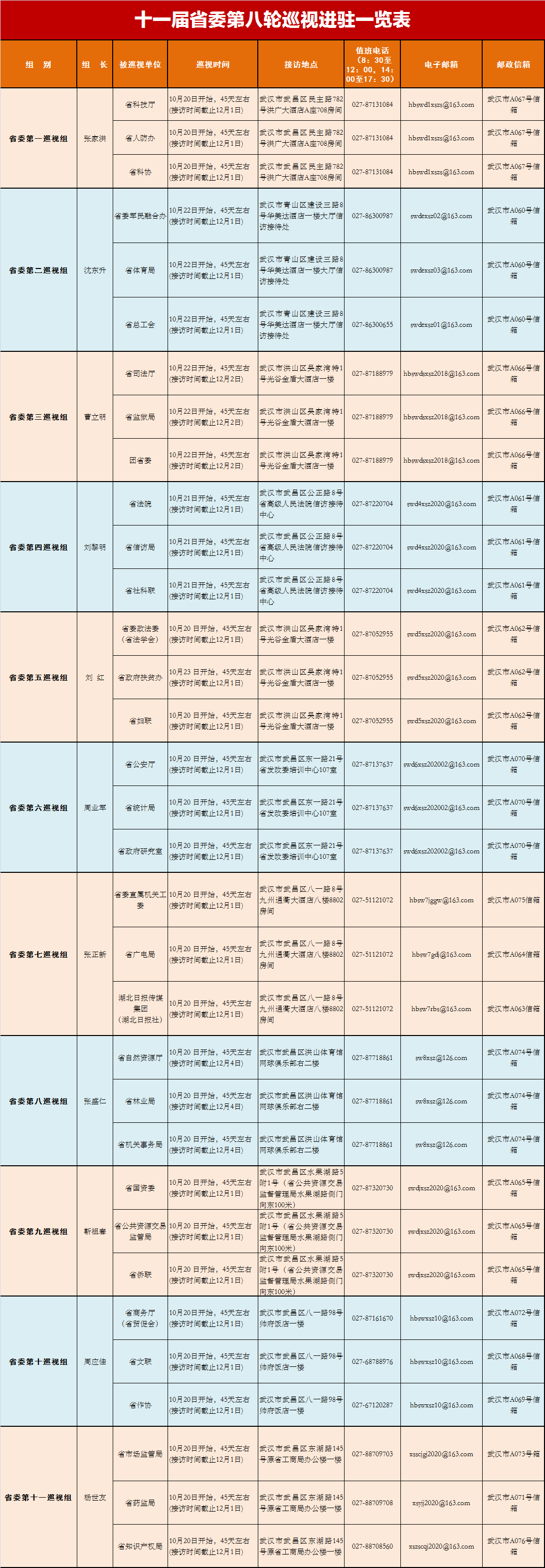 据悉,本轮巡视为期1个半月左右。各巡视组巡视期间分别设置值班电话和邮政信箱,设立群众来访接待点,主要受理反映被巡视单位领导班子及其成员、下一级党组织领导班子主要负责人和重要岗位领导人员问题的来信来电来访,重点是违反政治纪律、组织纪律、廉洁纪律、群众纪律、工作纪律和生活纪律等方面的举报和反映。(记者杨宏斌、通讯员刘宇航、实习生金凌云)