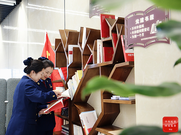 在建党100周年即将到来之际,杭州市临安区市场监督管理局行政审批中心窗口创建了党建书屋,为党员干部和办事群众提供党建红色阵地。图为在党建书屋,党员干部利用休息时间学习党建理论知识,更好地为办事群众和企业服务,以优良的作风打造一流营商环境。(浙江省杭州市临安区纪委监委供 金凯华 摄)