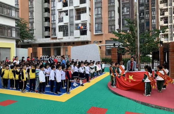 岭头幼儿园新园开园举行第一次升国旗仪式。