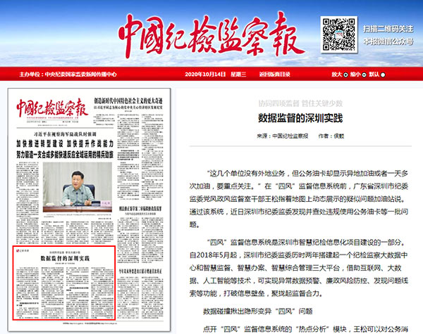“四风”监督信息系统是深圳市智慧纪检信息化项目建设的一部分。自2018年5月起,深圳市纪委监委历时两年搭建起一个纪检监察大数据中心和智慧监督、智慧办案、智慧综合管理三大平台,借助互联网、大数据、人工智能等技术,可实现异常数据预警、廉政风险防控、发现问题线索等功能,打破信息壁垒,聚拢起监督合力。