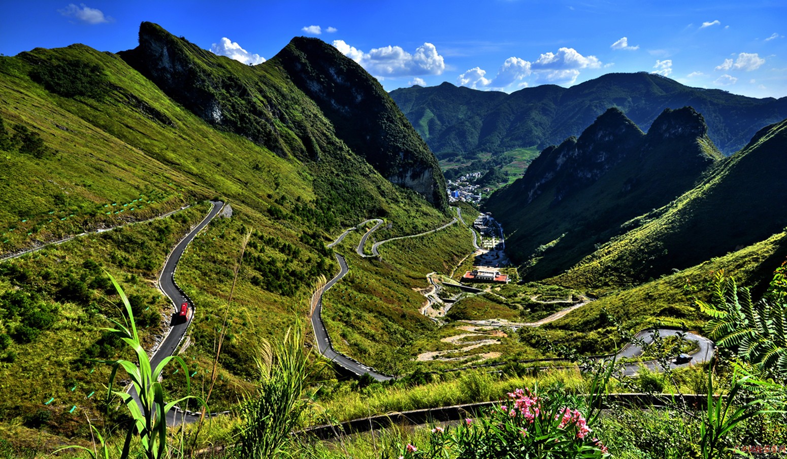 八里九弯是进入大化瑶族自治县七百弄国家地质公园的第一个山坳口,从山脚到山坳,八里路九道弯,弯弯曲曲的公路像神仙随意抛下的一根银绳,盘旋缠绕在披绿染青的悬崖陡坡间。(大化县纪委监委供图)