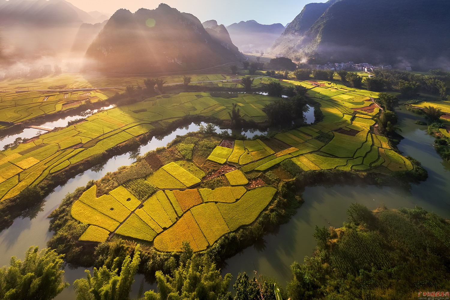 入秋以来,东兰县武篆镇江平田园,稻谷次第成熟,田园中青黄交错、层次感强,在白色的晨雾和金色的晨光的抚弄下,壮美秋色一呼而出。(东兰县纪委监委供图)