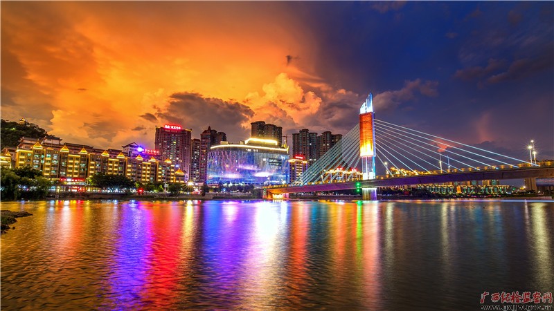 每当夜幕降临,贺州灵峰大桥附近就亮起了璀璨的灯光,绚烂无比的灯火晕染着天空,又倒映在波光粼粼的贺江水面,生动地描绘出一幅绝美的画作,流光溢彩,如梦如幻,美不胜收。(八步区纪委监委供图谢杰摄)