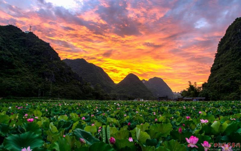 平果市坡造镇荷花基地,红霞映照荷塘美(平果市纪委监委提供图方吉铁/摄)