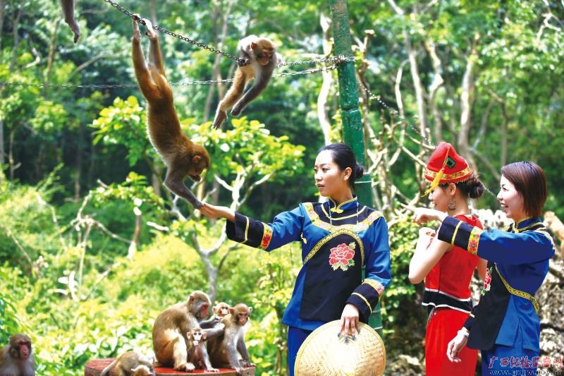 隆安县龙虎山自然保护区内古木森森,巨藤缠绕,秀树参天,空气清新。这里居住着约有8大部落”3200多只国家二级重点保护动物猕猴,是全国四大猴山之一。善于飞檐走壁的空军”猕猴正吊在钢丝上,拿走游客手中的果仁。人与自然,和谐相处,其乐融融。(南宁市文化广电和旅游局机关纪委供图)