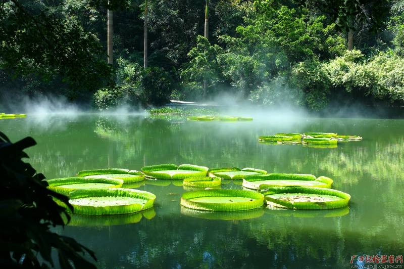 雨林大观是青秀山中独具热带、亚热带雨林特征的景区,占地500多亩,物种繁多,植被层叠,拥有各类热带、亚热带植物200多科2500多种300多万株,望天树、桫椤、降香黄檀等180多种国家级重点保护植物让人大开眼界。造型独特的莲叶卧于水面之上,静静等待着晨雾消散后,睡莲仙子凌波起舞。(南宁市文化广电和旅游局机关纪委供图)