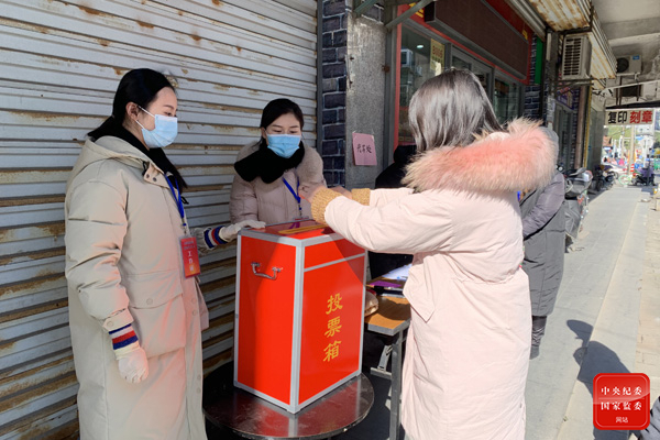 江苏省常州市天宁区村(社区)“两委”换届期间,区监委派出监察员办公室联合开发区(镇、街道)纪委,强化换届人选提名、考察、公示等环节监督检查,对扰乱和妨碍村级组织换届工作秩序、开展贿选拉票等造成不良影响的,发现一起、查处一起。图为监督组督查居委会换届投票现场。(江苏省常州市天宁区天宁街道纪委 葛华威 摄)