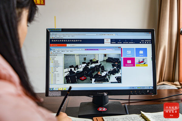 湖北省宣恩县纪委监委通过公共资源交易行政监督平台实时参与招投标,对项目招投标过程进行全程监督,维护公开、公平、公正市场秩序,为优化营商环境提供纪律保障。图为该县纪检监察干部远程监督招投标。(湖北省宣恩县纪委监委 梁国熠 摄)