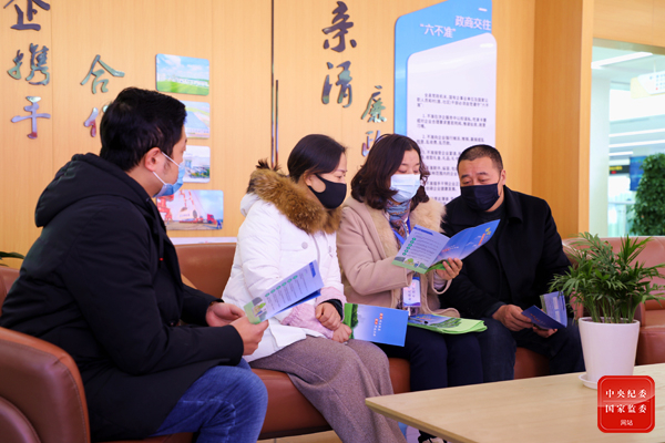 江苏省射阳县纪委监委紧盯涉企审批中存在的突出问题,通过面对面走访、发放调查问卷、召开座谈会等形式,查找损害营商环境的堵点、痛点、难点。图为该县纪检监察干部向企业负责人宣传政商交往六不准、六可以、六应当等规定。(江苏省射阳县纪委监委 高倩 摄)
