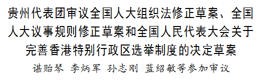 3月8日上午,十三届全国人大四次会议贵州代表团举行小组会议,审议全国人大组织法修正草案、全国人大议事规则修正草案和全国人民代表大会关于完善香港特别行政区选举制度的决定草案。