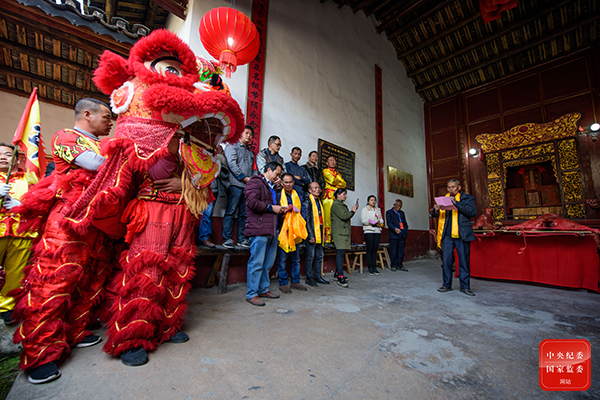 广西壮族自治区鹿寨县寨沙镇九敢村仁里屯是邓氏家族聚居地,现在依旧保存有广东客家民居风格的邓氏祖祠和客家围屋,邓氏家训告诫子孙要团结交流、勤奋上进、清白做人。图为邓氏族人在祖祠中聆听族长讲解家训家规。(广西壮族自治区柳州市鹿寨县纪委监委供 邓晓扬 摄)