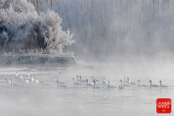 寒冬腊月天,太阳刚刚升起,新疆维吾尔自治区和静县开都河畔薄雾缭绕,天鹅们沐浴在河水之中,它们风姿绰约、袅袅婷婷,给寒冬增添了一丝浪漫。(新疆维吾尔自治区和静县纪委监委供 肖永浩 摄)