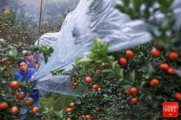 岁末隆冬,天寒地冻。重庆市长寿区龙河镇果农冒着严寒为杂柑“盖被子”,保障其良好生长态势,以期赶上春节的销售旺季,有个好收成。(重庆市长寿区纪委监委供 李炎 摄)