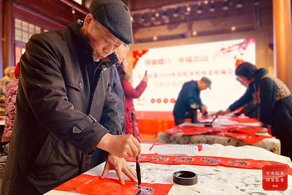 今年的大寒适逢腊八节,在杭州市西湖区北山街道弥陀寺公园里,书法爱好者正在挥毫泼墨,为街坊友邻们书写“福”字和新春对联,传递浓浓的传统节日韵味。(杭州市西湖区北山街道纪工委供 张静 摄)