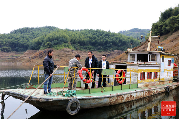 福建省福鼎市纪委监委持续聚焦生态环境,为打赢污染防治攻坚战,深入辖区内林场、河流、水库开展一线监督,推动生态环境保护决策落实落细,护航美丽中国建设。图为该市纪检监察干部在桑园水库了解中央环保政策落实情况。(福建省福鼎市纪委监委 陈是 摄)