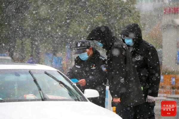 战疫情,斗风雪。在湖北枝江防疫检查点上,公安民警顶风冒雪坚守在防疫一线,严格执行过往车辆扫码、登记等防控举措,他们的坚守成为了战疫路上别样的“警色”。(湖北省枝江市纪委监委供 许俊富 摄)