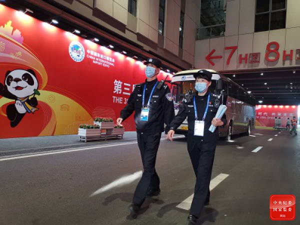 上海市公安局国家会展中心治安派出所加强对场馆的消防安全巡检,对发现的各类火灾隐患及时督促整改,确保馆内消防安全工作万无一失。图为第三届中国国际进口博览会期间,该所民警在馆内开展消防安全巡检。(上海市纪委监委驻市公安局纪检监察组供 谢继恩 摄)