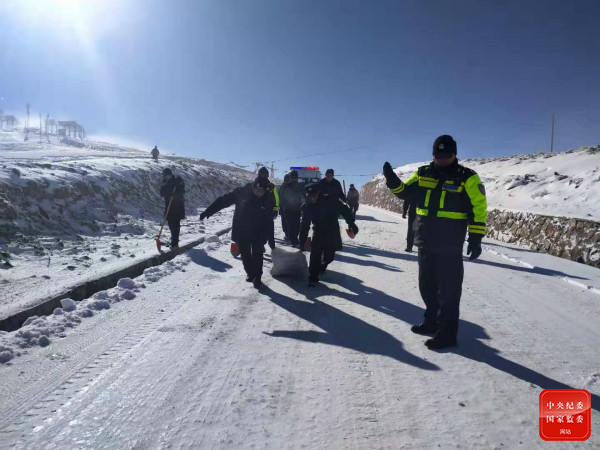 1月5日清晨,西藏自治区萨嘎县辖区普降大雪,积雪深度达50mm,国道积雪结冰,群众出行受阻。广大公安民(辅)警积极投入到铲雪、清路工作中,以实际行动向警旗添彩。(西藏自治区纪委监委供 林文平 摄)