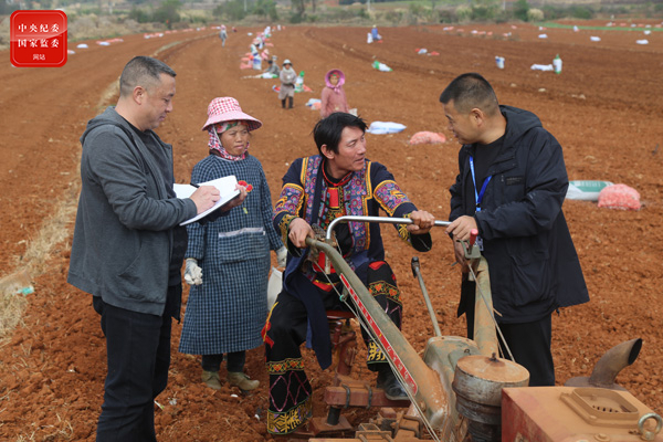 云南省文山市纪委监委发挥群众参与监督作用,加强对扶贫领域的资金扶持、项目建设,集体经济,村干部作风问题等的贴身监督、有效监督。图为该市纪检监察干部在红甸乡向群众监督员了解村干部履职情况。(云南省文山市纪委监委 马文艳 摄)