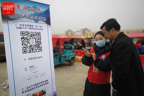 贵州省安顺市西秀区纪委监委运用清廉西秀微信公众号,向群众介绍微信举报平台使用方法,进一步畅通监督举报渠道,形成“人人能监督、时时可举报”的群众监督网络。(贵州省安顺市西秀区纪委监委 王小翠 摄)