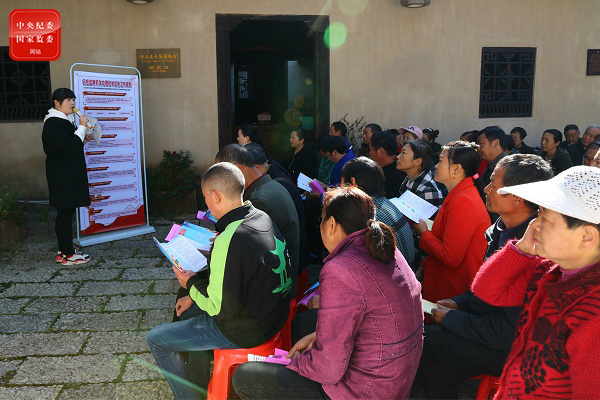 湖北省兴山县纪委监委前移监督关口,在开通举报专线、乡镇集中接访点的基础上,推动县乡村三级纪检监察干部下沉一线,通过屋场院子会、入户走访等方式变被动接访为主动下访,让基层群众切实感受到自己在参与监督。图为该县纪委监委干部组织屋场院子会,向群众解读检举控告受理范围和受理方式。(湖北省兴山县纪委监委 万晶晶 摄)