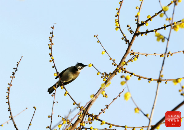 在安徽省亳州市曹操公园的腊梅园里,悄然开放的腊梅花黄似蜡、浓香扑鼻,引得鸟儿在花枝驻足流连。(安徽省亳州市纪委监委 程伟如 摄)