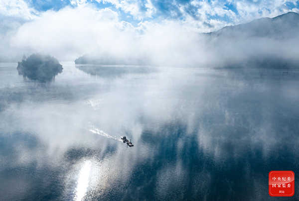 冬至时节,云南省龙陵县蚌渺水库弥漫着冬天的味道。远山白雾,近水轻舟,湖光倒影,如一幅清幽淡雅的水墨画。(云南省龙陵县纪委监委供 朱昌维 摄)