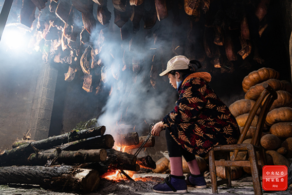 火炕腊肉是湖北省恩施土家族苗族自治州宣恩县冬季的特色民俗,村民们都会忙着将猪肉腌制数日,挂上火炕用柴火烟熏至色泽金黄透亮,等春节再拿来招待客人。(湖北省宣恩县纪委监委供 梁国熠 摄)