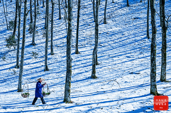 雪后的树林在阳光下光影错落有致,一位农人挑着蔬菜走在林间,构成一幅冬日山居图。(杭州市淳安县纪委监委供 余诗祥 摄)