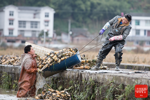 冬至前后,正是莲藕收获的季节。重庆市南川区兴隆镇金星社区的藕田里,一对夫妻正合力将刚刚采摘的莲藕运到田埂上晾干。(重庆市南川区纪委监委供 夏于洪 摄)