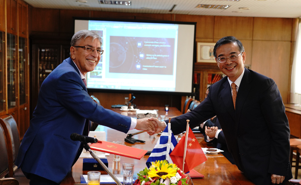 图为周强与希腊最高法院院长察拉加尼季斯共同签署两国最高法院交流与合作谅解备忘录。张艳兵 摄