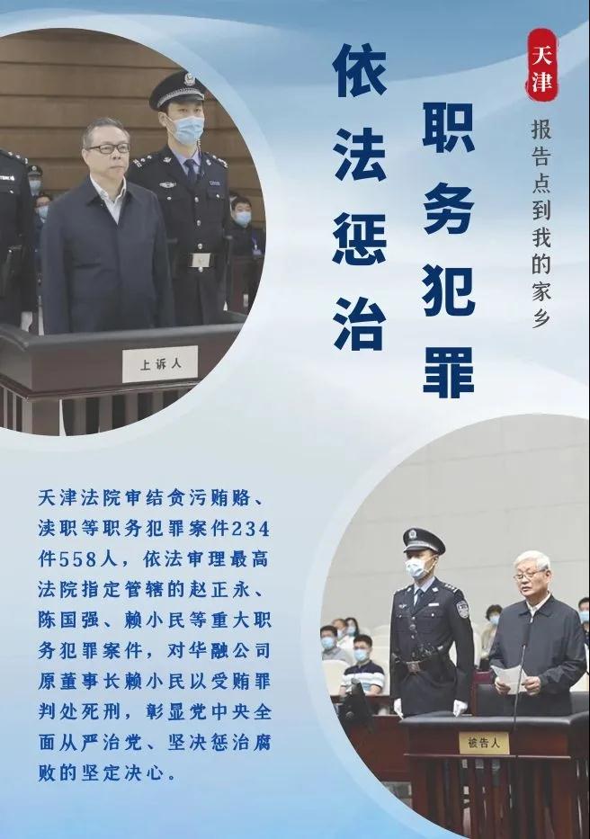 3月8日,最高人民法院院长周强在第十三届全国人民代表大会第四次会议上作最高人民法院工作报告,多次提到了天津法院工作。让我们一起为天津法院点赞! 亮点一 了解详情 天津高院对中国华融资产管理股份有限公司原党委书记、董事长赖小民受贿、贪污、重婚案二审公开宣判,裁定驳回上诉,维持原判。赖小民犯受贿罪、贪污罪、重婚罪,数罪并罚,判处死刑。经最高人民法院核准,天津二中院依照法定程序对赖小民执行了死刑。 天津一中院认为,被告人赵正永的行为构成受贿罪,且受贿数额特别巨大,犯罪情节特别严重,社会影响特别恶劣,给国家和人民利益造成特别重大损失,对被告人赵正永判处死刑,缓期二年执行,剥夺政治权利终身,并处没收个人全部财产,在其死刑缓期执行二年期满依法减为无期徒刑后,终身监禁,不得减刑、假释。 我们还做了这些 天津法院坚决落实反腐败斗争决策部署,审结贪污贿赂、渎职等职务犯罪案件234件558人,彰显了党中央全面从严治党、坚决惩治腐败的坚定决心。 亮点二 了解详情 推动京津冀协同发展,是党中央、国务院在新的历史条件下作出的重大决策部署,是一项重大国家战略。一直以来,天津法院高度重视京津冀协同发展和雄安新区建设国家战略,认真落实党中央决策部署和市委要求,立足天津功能定位和法院工作实际扎实开展此项工作。 我们还做了这些 通过建立京津冀三地法院联席会议机制、出台具体实施意见、签订框架协议等举措,切实增强三地法院协调联动能力;通过构建完善常态化司法协作机制、跨区域诉讼服务机制、执行联动协作机制、京津冀司法资源共享机制等举措,深入推进三地法院在立案、审判、执行各阶段的协作力度;通过持续强化金融审判、海事审判、知识产权审判、生态环境审判等司法能力,不断提升服务保障“一基地三区”建设水平。 今后,天津法院将继续立足审判职能,进一步健全与北京、河北两地法院的司法协作工作机制,促进京津冀地区创新、协调、绿色、开放、共享发展,为京津冀协同发展提供更加优质高效的司法服务和保障。 亮点三 了解详情 未成年人刘某辍学在家,使用父母用于生意资金流转的银行卡,多次向某科技公司账户转账用于打赏直播平台主播。父母得知后希望公司退还全部打赏金遭拒,刘某诉至法院要求某科技公司返还上述款项。天津三中院审理中促成当事双方达成庭外和解,公司自愿返还打赏款项并已履行完毕。 本案树立了正确的社会价值导向——社会各界都有责任和义务维护未成年人的合法权益。诸多网络平台在此案后采取内容分级审核、用户身份核实、设置消费预警线、时间限制等方式,优化网络内容和服务;同时也让更多家长更加重视网络这个无形环境对孩子成长的影响。 法院通过个案办理,妥善处理因网络新事物发生的各种纠纷,发挥了规制和引导作用。人民法院结合民法典立法精神和规定,将权利保护理念融入处理民事纠纷的过程中,全面保护人民群众的各项权利。 我们还做了这些 切实贯彻特殊、优先保护未成年人的政策精神是人民法院的重要职责和神圣使命,天津法院坚决防止和依法打击损害少年儿童权益、破坏少年儿童身心健康的行为,依法严惩各类侵害未成年人权益的违法犯罪,妥善审理家事案件,努力为少年儿童健康成长营造良好环境。 天津法院坚持打防并举,对侵害未成年人犯罪案件重拳出击,坚持零容忍态度,依法审判社会关注度高的针扎幼儿案、保姆虐待被看护人案、遗弃新生婴儿案,并对相关被告人作出从业禁止;坚持惩教一体,坚持“教育、感化、挽救”方针和未成年人利益最大化原则,贯彻双向保护政策,严格落实不公开审理、未成年人犯罪记录封存和逐案逐人回访帮教三个100%,强化庭前调查、庭中教育、庭后回访,建立回访台账,了解思想和生活状况,注重未成年人的心理帮扶;充分发挥典型案例的示范引导作用,2020年天津高院先后两次发布了涉争夺抚养权典型案例和依法保护未成年人典型案例,两个案例入选市妇联与市委政法委联合评选的“妇女儿童维权典型案例”;从源头提升未成年人自我保护意识,与中小学联手共建法治校园,安排法官担任辖区中小学法治副校长,组织法治宣传进校园、庭审观摩、法院开放日等活动,送法到未成年人身边。
