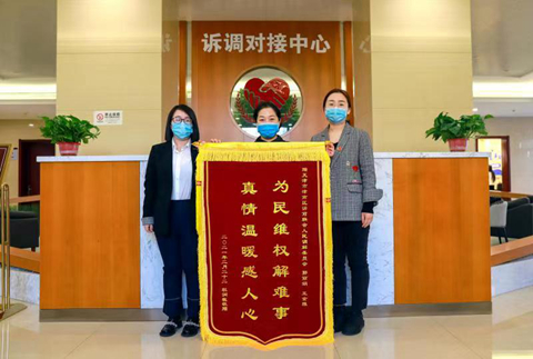 十点半,一名当事人满脸喜气的为正在调解的郭立娟送来了锦旗,“我提前也没告诉小郭,送锦旗也没有别的意思,就是表达一下心情,我这钱都八年了,可算是要回来了,还是法院力度大,调解的又好又快!”