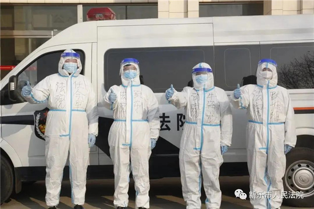 22日早七点,李院长与石家庄药房处确定好出发及接头时间,王主任协调好街道办增援两名志愿者,新乐法院法警队队长任会军、干警张轩、牛海龙、默坤阳穿好防护服,集结准备!