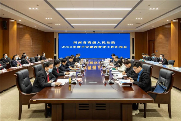考评组首先观看了《2020年度省法院平安建设工作回眸》宣传片;李和平组长就做好省法院2020年度平安建设实地考评工作提出了明确要求;省法院党组副书记、常务副院长王树茂从加强组织领导、全力化解矛盾纠纷、扎实开展扫黑除恶专项斗争、努力提升案件质效等十一个方面,向考评组汇报了2020年度省法院平安建设工作情况,表示要以考评为契机,认真学习贯彻习近平法治思想,坚决贯彻落实省委、省委政法委、省平安建设领导小组工作部署,毫不松懈地抓好常态化疫情防控和审判执行工作,履行好防范重大风险、维护社会稳定重大政治责任,为建设更高水平的平安河南做出新的更大贡献。