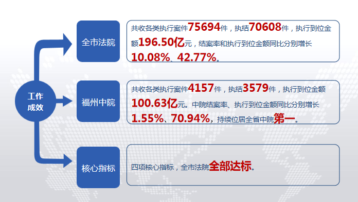 2020年,福州法院坚持课题式设计,改革创新呈现新突破;工程式推进,重点工作实现新进展;综合式治理,平安建设形成新样板;绩效化管理,促进队伍建设新变化。全市法院执结各类案件70608件,执行到位金额196.50亿元,中院执结3579件,执行到位金额100.63亿元,四项核心指标,全市法院全部达标。中院结案数、执行到位金额、财产保全数量位居全省中院第一。中院在全省法院深入推进扫黑除恶专项斗争会议上作为唯一中院代表作经验交流。强力执结林德发、林风等人涉黑案,获评2020年度福建法院十大执行案件。率先在全省成立“根治欠薪联动执行工作室”,“法院执行+劳动维权”执行联动机制被国务院根治拖欠农民工工资工作领导小组以《简报》形式向全国推广。