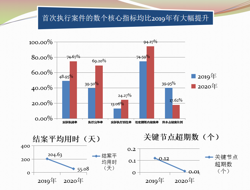 宁德法院坚持“三深化”构建综合治理新格局,“三创新”助推执行模式新变革,“三统一”实现执行管理新突破。2020年,宁德法院执行质效连续排名全省第1名,中院执行质效长期位居全省中院前3位,在省法院通报的21项质效评估数据中,全省排名第一5项、16项优于全省均值,“3+1”核心指标始终处于高位运行,执源治理成效受到省法院吴偕林院长批示肯定,要求在全省复制推广,创新实行失信被执行人信用修复激励机制被写入最高人民法院工作报告,入选2020年度福建法院“十大改革创新举措”,众友公司合同执行案入选2020年度福建法院“十大执行案件”。全市法院新收执行案件19791件、同比下降13.42%,降幅全省最大;在全省率先推行执行立案时取消由申请执行人提供生效证明、领取执行案款“最多跑一次”“不见面发放”工作机制,试行“执行通知前置裁判文书”机制。