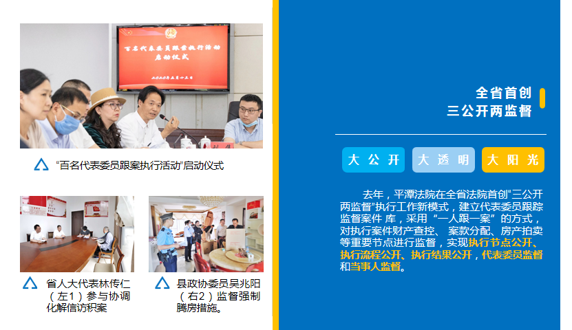 南平法院聚力推进执行质效提升,扎实开展“三大工程”;聚力推进执行专项活动,重点打好“三大攻坚战”;聚力推进服务发展大局,做到“四个突出”;聚力推进执行联动机制建设,做到“三个持续”;聚力推进执行队伍建设,做到“四个强化”。两级法院新收执行案件同比上升1.36%,执行结案率同比上升1.37%,未结案件同比下降12.61%,执行标的到位款同比上升16.4%。中院实际执结率等15个指标、两级法院实际执行到位率等8个指标优于全省、全国均值,中院执行质效指标位列全省各中院第一,3个基层法院执行质效指标进入全省前十。在全国、全省首创碳汇认购、巡山、巡河替代执行机制;推广全省首创的“农民工应急基金”制度,129名困难申请人及时得到救助276.83万元;推行分段集约办案机制,建立“执行接待日”制度,结案平均用时缩短了25个工作日。