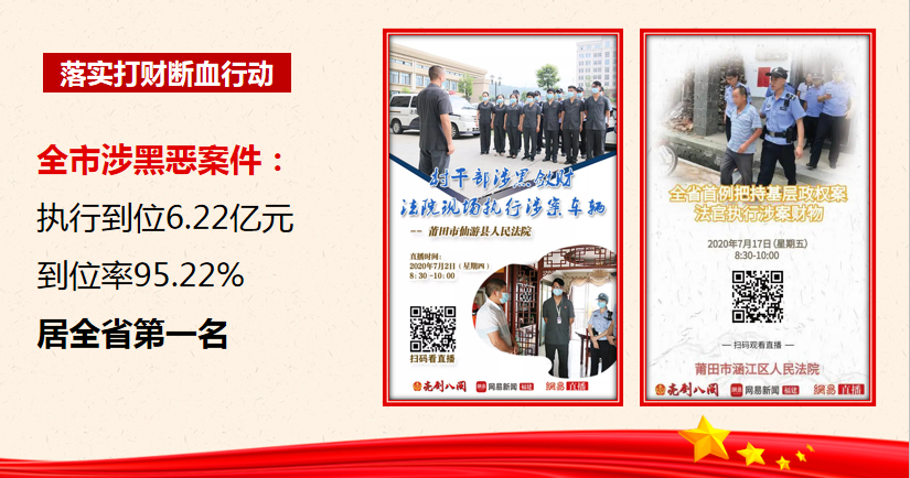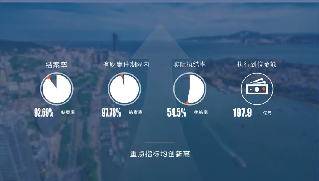 厦门法院以提升质效为龙头,坚持在办案防疫兼顾双赢、执行三个中心一体建设、打造一流营商环境、优化执行联动机制、加强执行队伍建设上持续发力。结案率、有财案件期限内结案率、实际执结率、执行到位金额等重点指标均创新高;“黑财”执行到位1.25亿元,提前三个月在全省率先完成全年任务;在省委政法委执行案件评查活动中,厦门法院是九地市唯一无三类案件地区,且一类案件数占全省近四分之一,案件质量全省最高;全市法院拍卖标的1855宗,成交金额35.29亿元,累计为地方创税5.16亿元;首执案件执行到位金额194.28亿元,居全省第一;成立全省首个财产保全中心;制定全市“执行合同”指标评价标准,厦门连续三年进入全国营商环境评价前十名,成为“执行合同”标杆城市。